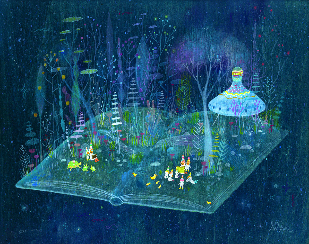 We create rich and colorful gouache/acrylic paintings on wood featuring the utopian lives and adventures of curious little beings living harmoniously in lush fantastic environments surrounded by friendly little animals.