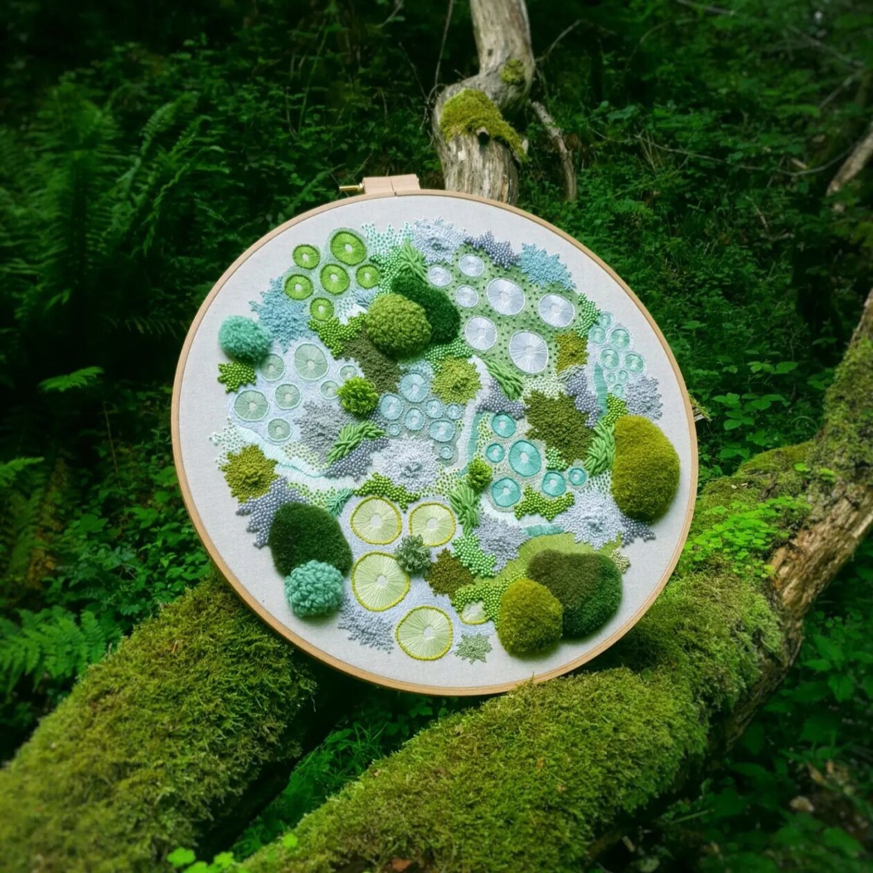 Hannah Kwasnycia, aka MildMoss, is a Canadian artist who creates abstract embroidery hoops inspired by nature. She uses colorful threads, beads, and sequins to stitch intricate patterns that resemble moss, coral, lichen, mold, and bacteria cultures. She does not follow any predefined design, but rather experiments with different shapes, colors, and textures to capture the organic beauty of living organisms.