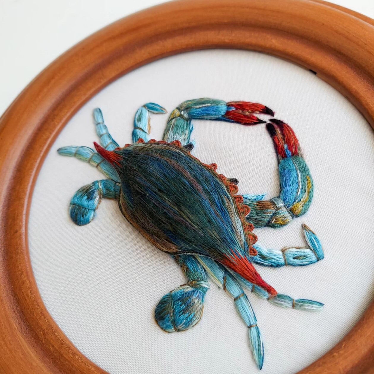 Megan Zaniewski (previously featured) is an artist who has mastered the art of bringing embroidery to life with her three-dimensional creations. Utilizing the stumpwork technique, she meticulously crafts intricate designs that rise from the fabric, giving a lifelike presence to her subjects. Her work often features the delicate beauty of winged insects, where she employs thin jewelry wire to sculpt the form of each wing, filling in the shapes with a combination of long and short stitches.