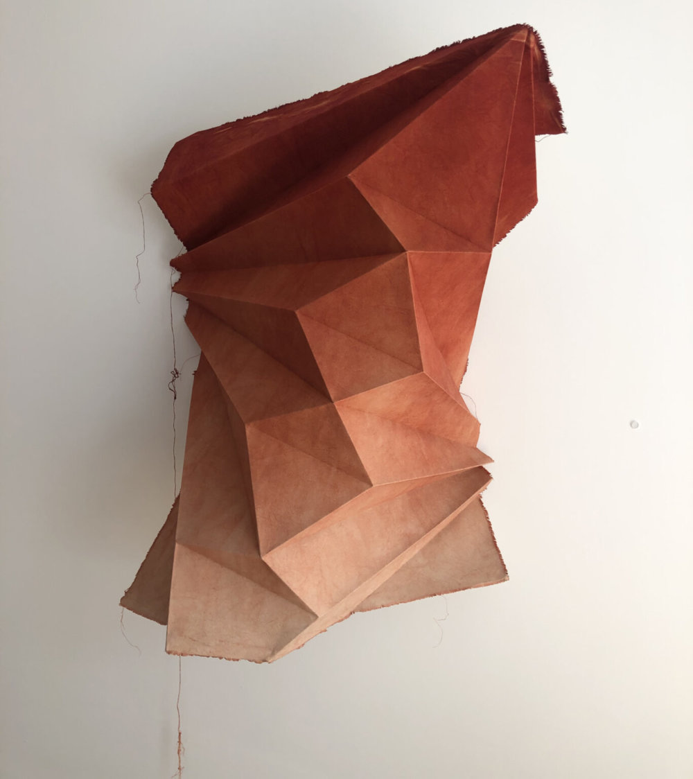 While my earlier works have smooth monochromatic surfaces in my latest body of work I felt an urge to introduce a painterly gesture and an element of chance to counterbalance the stringent geometrical appearance of the crease-patterns… Both Origami and natural dyeing are techniques that have rarely been harnessed in fine arts that unlock an intriguing field of unexplored narratives.