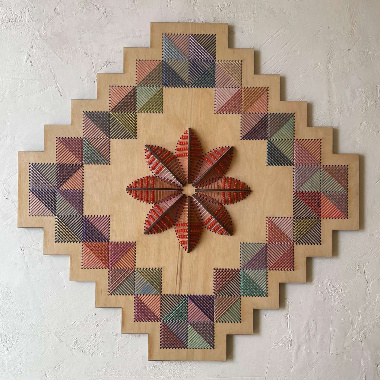 Her creations are characterized by vibrant cotton threads stitched onto wooden panels, incorporating elements such as architectural arabesques, phulkari (floral folk embroideries), and bagh (woodblock-printed reliefs). To add depth and visual intrigue, Iqbal employs half-circles and semi-precious beads, which interact with light to create shifting experiences of color and form. This meticulous attention to detail invites viewers to engage with the work from multiple perspectives, revealing new facets with each viewing.