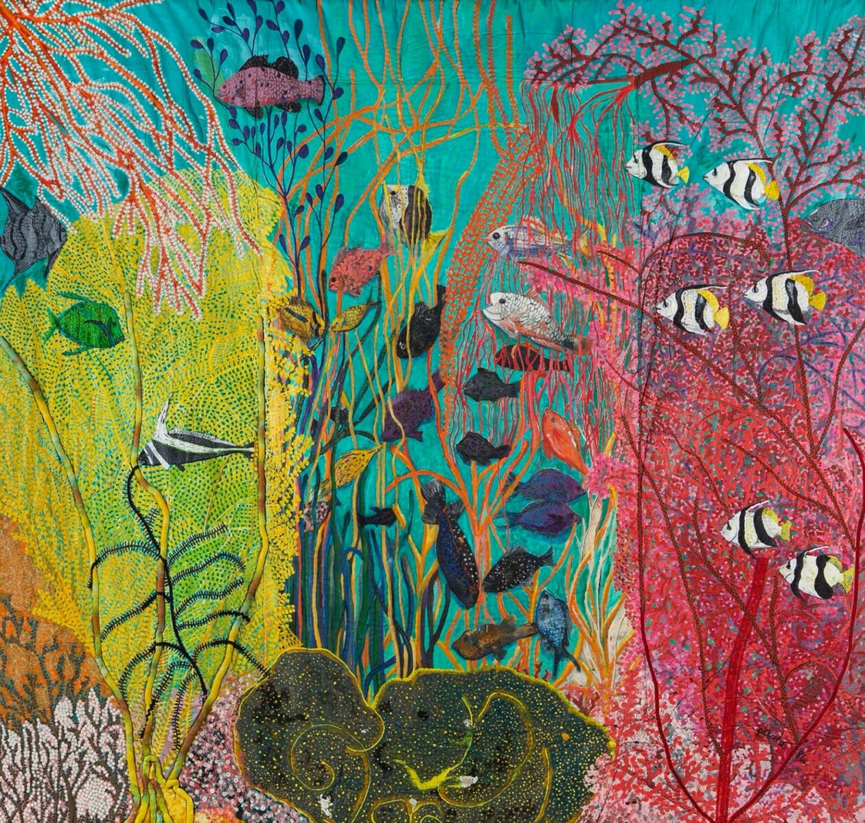 Abad’s quilts are more than just depictions of marine life; they are portals to a world of shimmering light and overflowing abundance. Fabric scraps transform into schools of exotic fish, while beads and sequins become glistening coral reefs. Each stitch pulsates with life, inviting us to dive into the cool embrace of the underwater world. Abad’s masterful use of mixed media creates a captivating textural experience, further enhancing the illusion of depth and movement.