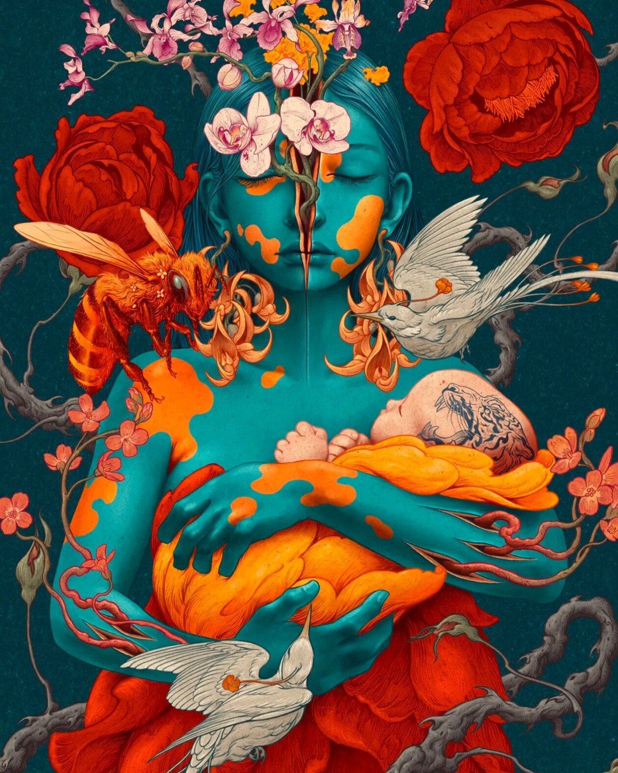 Indonesian artist Garis Edelweiss, hailing from Pasuruan, creates intricate narratives through his graphite pencil drawings on paper, canvas, and wood. His work is a mesmerizing blend of vivid colors, symbolism, and darkness. Edelweiss often employs orange and turquoise as his main palette, infusing his pieces with an otherworldly quality.