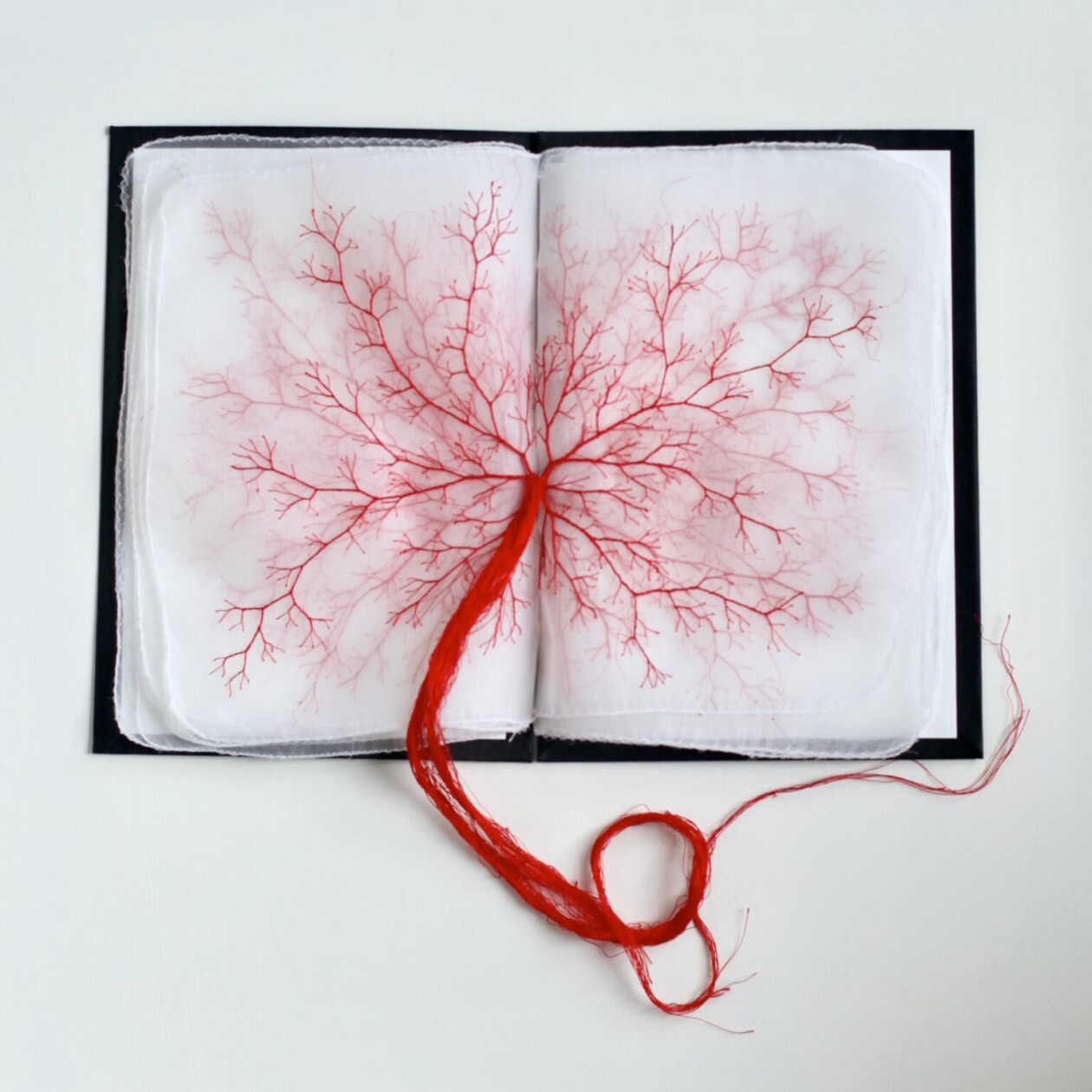 In her series of exquisite fabric sculptures, titled ‘Red Threads’, Rima Day weaves together her love for books and nature. Each hand-bound creation features soft, translucent pages adorned with abstract red tendrils. These threads sprawl across the spreads, evoking the intricate networks found in veins and roots. The black covers provide a striking contrast, emphasizing the delicate red threads that emerge from underneath. Day’s use of red thread symbolizes human connection, adding depth and meaning to her art.