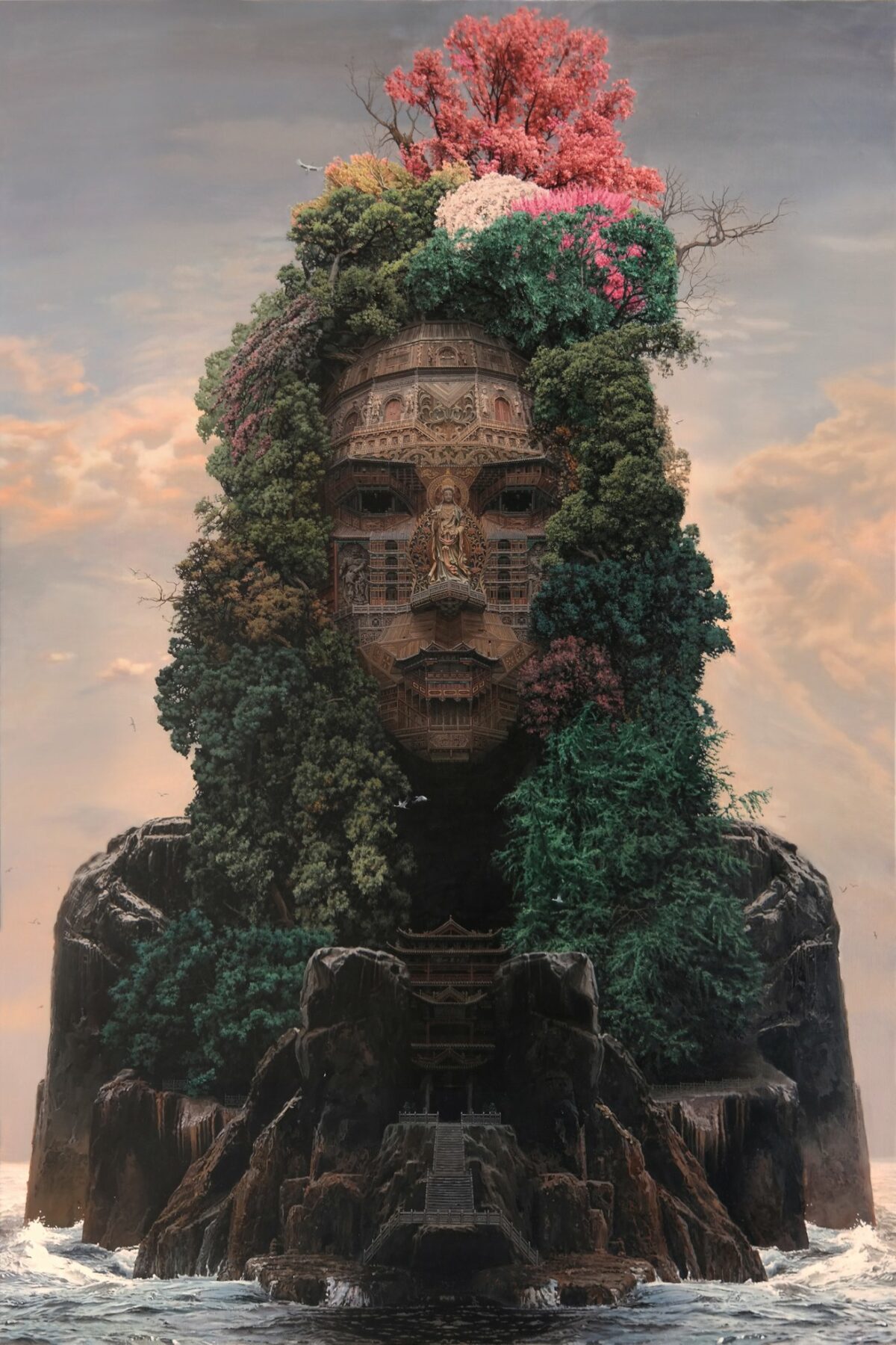 In the “Revels of the Rock Gods”, DU Kun breathes life into an ethereal world where Chinese rockstars transcend mere musicianship to become towering titans. His series crafts a fantastical realm where these figures are depicted as monumental temples, intricately carved into mountains and rock faces, echoing the grandeur of ancient Chinese architecture. Through his surrealistic style, Kun weaves elements of traditional aesthetics with hints of psychedelic flair, creating visuals that are as arresting as they are meticulously detailed. Each artwork resonates with the energy and spirit of the rockstars, encapsulating their impact on both cultural and musical landscapes in China.