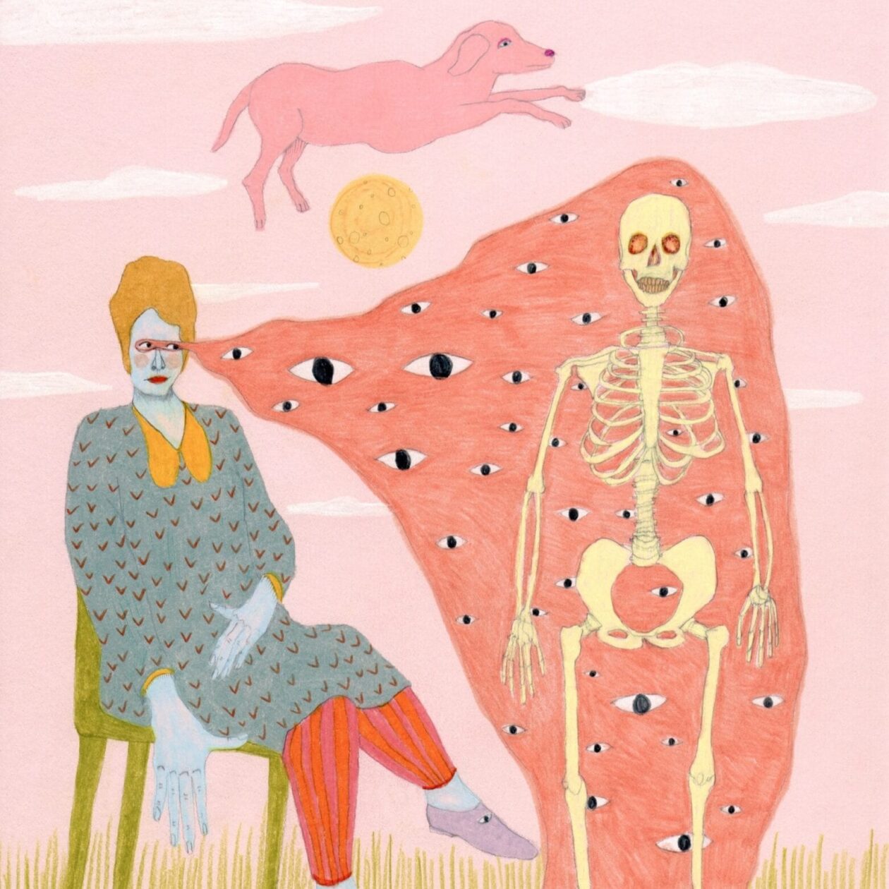 The resulting compositions shimmer with gentle chaos — floating eyes, leaping animals, and fused figures drift through layered narratives rich with stripes, dots, and tangled forms. Mack distorts familiar elements into gentle oddities, as though reshaping the natural world to accommodate new fables. Her works are more than illustrations; they are soft-spoken portals into a universe built on curiosity, kindness, and the occasional burst of bubblegum fantasy.
