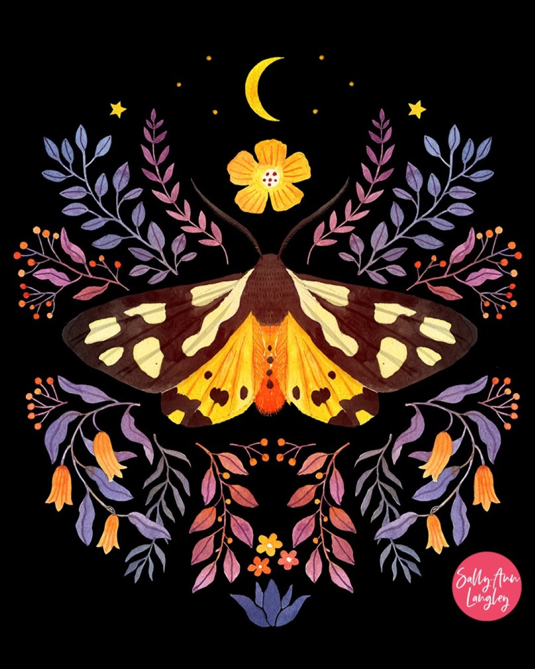 Sally-Ann Langley creates botanical-inspired watercolors that blend vibrant color with contemporary flair. A British-born artist now based in Petaluma, California, Langley draws inspiration from the flora and fauna of Northern California’s wine country. Her practice involves hand-painting each piece in watercolor before composing the final image in Procreate and Photoshop, using high-end scanning to preserve the delicate details of her original paintings. The patterns and textures found in nature serve as a constant source of wonder in her creative process, which she translates into stylized botanicals and landscapes that capture the essence of her surroundings.