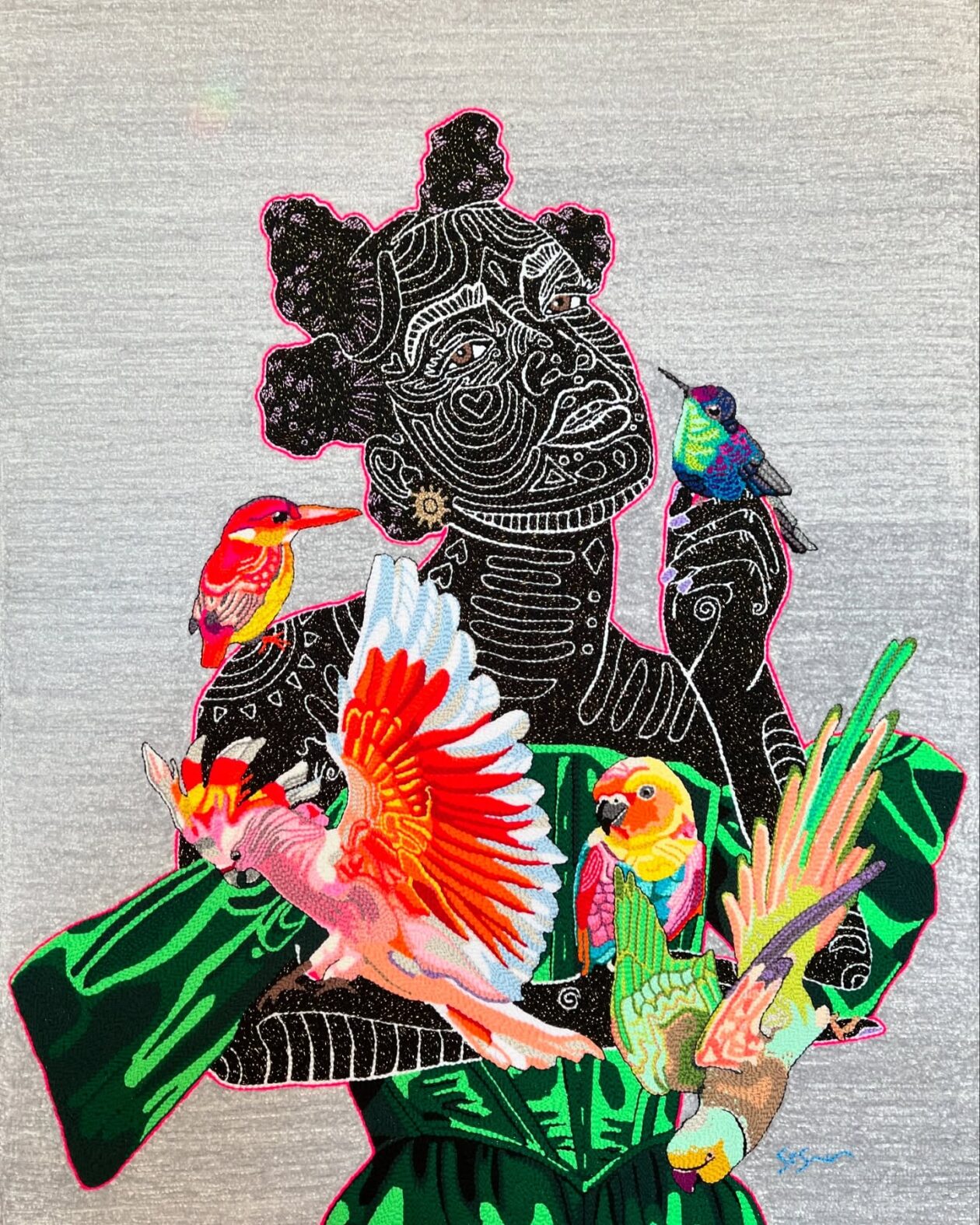 Rooted in the deep legacies of the global Black diaspora, Saunders’ practice is as intellectually potent as it is visually sumptuous. Her textiles blend nostalgia, heritage, and personal experience, translating them into layered compositions that celebrate survival and transformation. By working in a medium historically viewed as subordinate to painting or sculpture, she redefines both the form and its function. In Saunders’ hands, textile art becomes a site of resistance, reverence, and radical beauty.