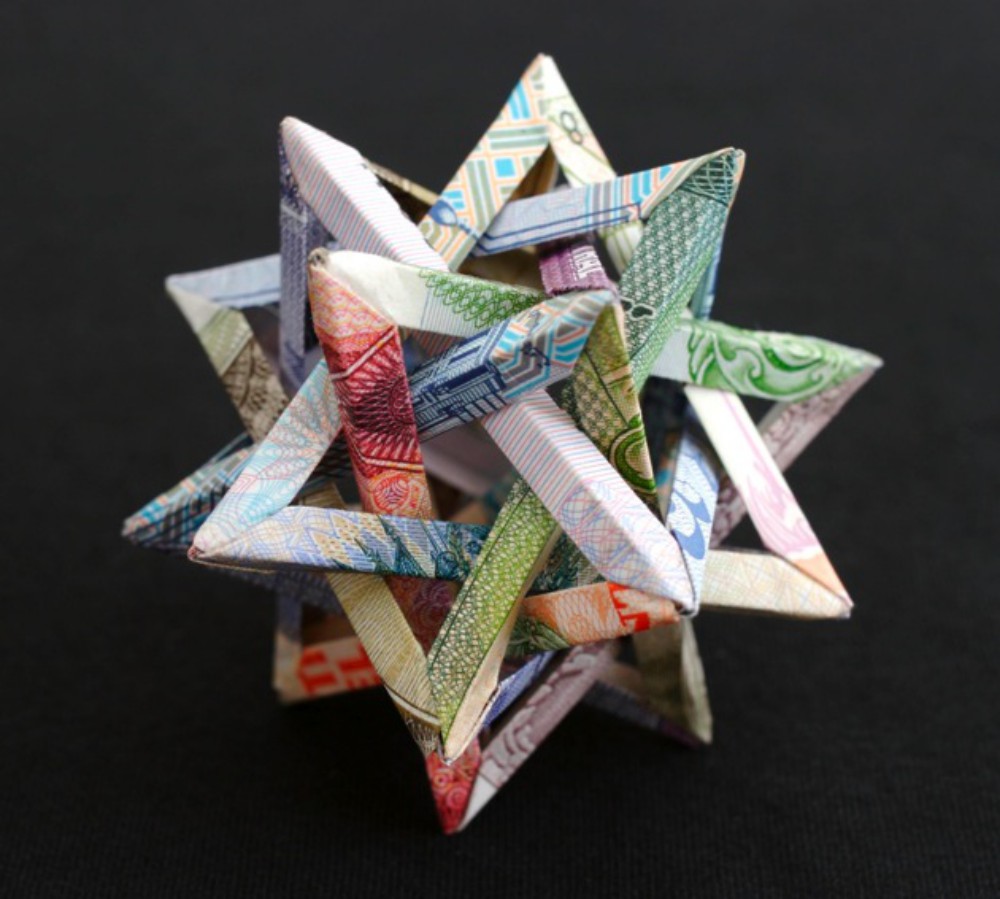 Malakoff’s sculptures are both precise and captivating, each piece revealing a complex interplay of geometry and artistry. The intricate patterns and symmetrical designs showcase her exceptional talent and attention to detail, transforming mere paper into elaborate three-dimensional forms. The vibrant hues of the different currencies intertwine seamlessly, adding an extra layer of visual interest and cultural significance to each sculpture. These stunning polyhedra are more than just art; they are a testament to Malakoff’s vision of integrating global elements into a cohesive, beautiful whole, sparking viewers to see the world — and its currency — through an entirely different lens.