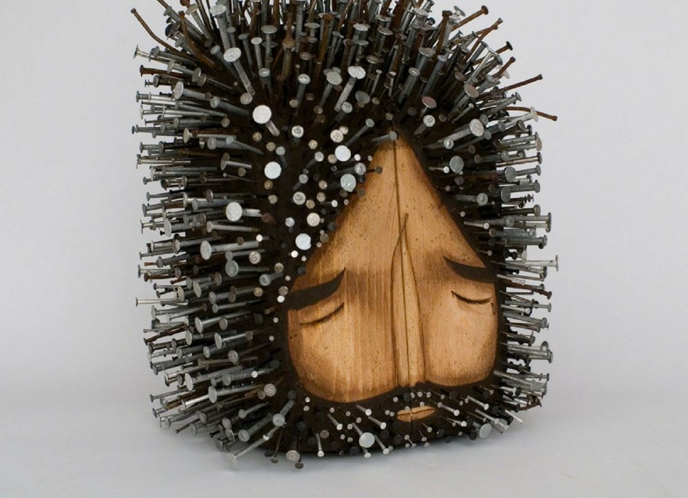 Jaime Molina, a Denver-based artist, brings a unique blend of painting, sculpture, and graffiti to life through his stunning figurative wood sculptures. His works are characterized by large heads and angular bodies, often split open to reveal inner objects like cacti, honeybees, or small houses. What sets Molina’s sculptures apart is the use of hundreds of nails that pierce through the wood, forming dense blankets of spikes that serve as hair for his bearded characters.