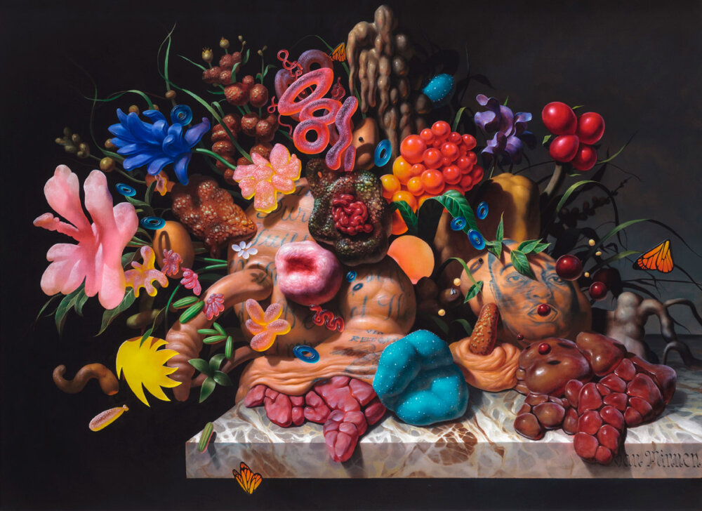 Van Minnen’s use of vibrant colors and classical references adds an extra layer of complexity to his work. The candy itself is rendered in mouthwatering detail, tempting the viewer to reach in and grab a piece. But the settings and situations in which the gummies find themselves are anything but sweet. Think gummy bears melting in a vat of acid, or suspended in a spiderweb – these are not the gummies of your childhood. By creating this push-and-pull effect, van Minnen forces the viewer to confront the unexpected and the unsettling.