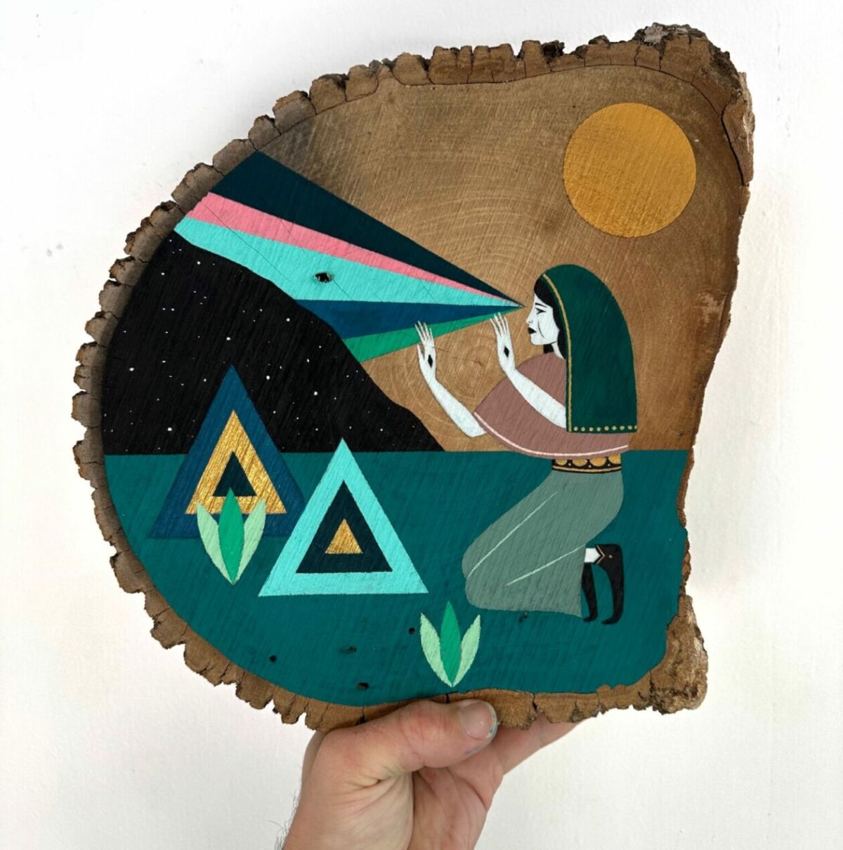 Adrian Landon Brooks is an artist who creates captivating paintings that blend the surreal with the spiritual. His unique approach involves using wood slices as his canvas, where he paints otherworldly scenes that evoke a sense of ritual and wonder. Brooks’ work is characterized by its mythical themes and the use of bold colors juxtaposed with organic elements like starry skies and simple floral designs.