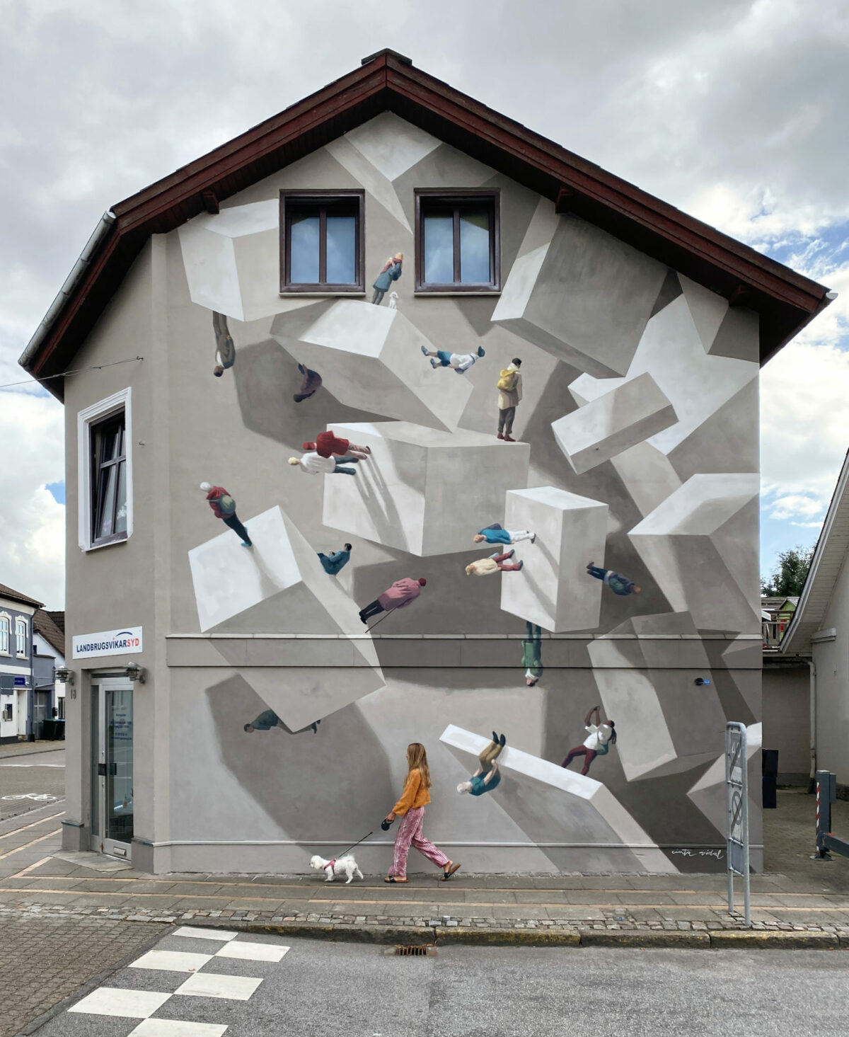 Barcelona-based artist Cinta Vidal (previously featured) creates surreal murals that defy the norms of traditional art with floating objects and distorted architectural structures. Her work challenges perceptions of space and reality, merging everyday items with impossible landscapes. Vidal’s murals often depict buildings and objects floating in a dreamlike state, disconnected from gravity and conventional logic. This unique style encourages us to see the world through a different lens, questioning their understanding of space and form.