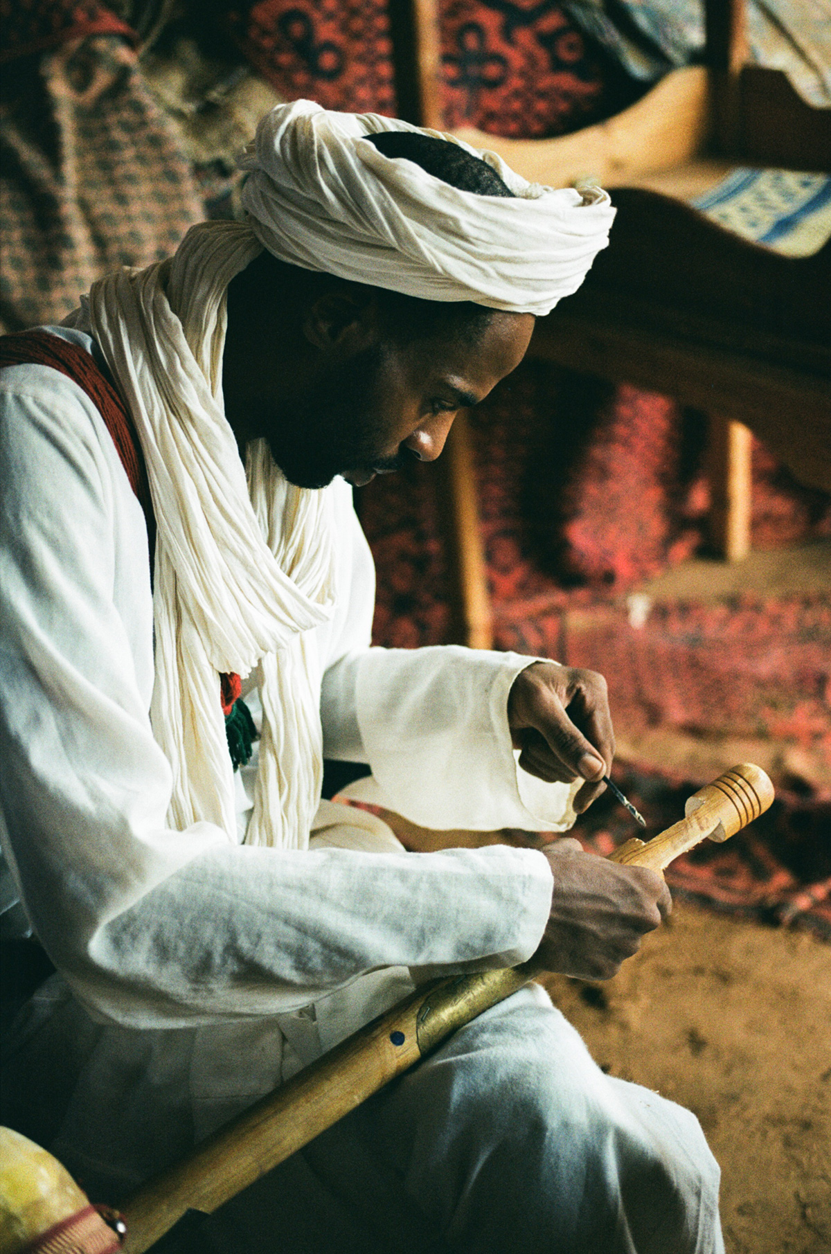 The project emerged from a multidisciplinary residency where an ephemeral recording studio was constructed inside a mud house to archive the voices of local musicians. Al-izzi aims to translate the rich history of a community whose music preserves ancestral memory despite the challenges of desertification. His photography is one component of a larger body of work that includes a short film, a music album, and a book. This collection of images serves as a powerful record of cultural continuity, showing how knowledge is passed down through generations in the face of environmental and social change.