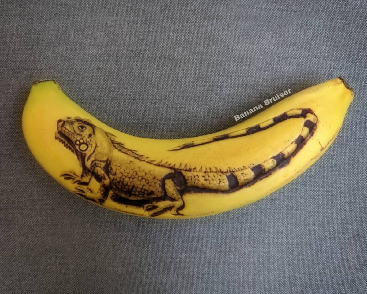 Anna Chojnicka, known as Banana Bruiser, has transformed the ephemeral canvas of banana peels into a stage for her intricate art. With the simple tools of a pin and a comb, she meticulously bruises the surface of the fruit, a technique that reveals more detail as the peel naturally darkens over time.
