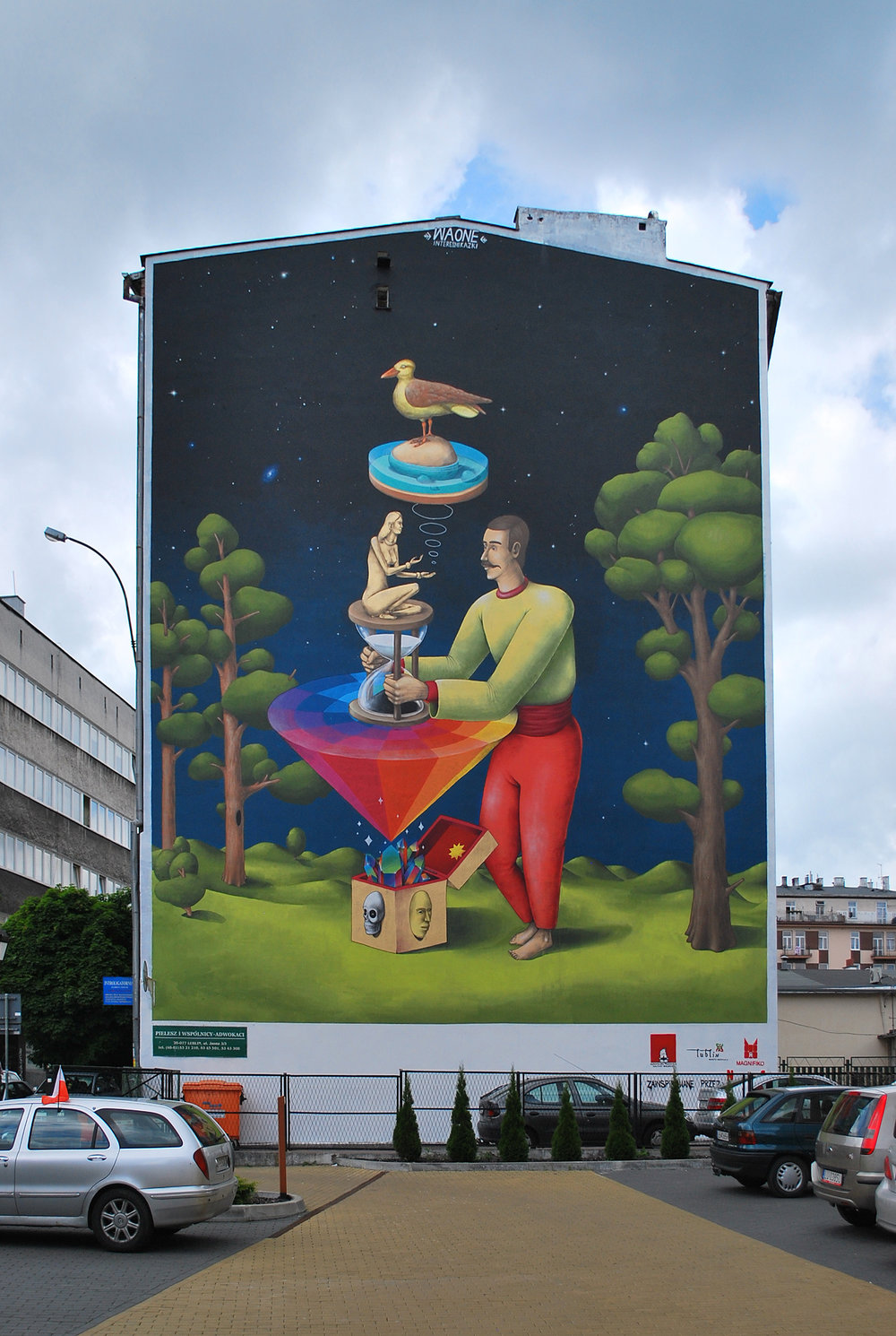 At the heart of WAONE’s creations lies a quest for self-discovery and an exploration of the world through a unique lens. His artistic journey began in 1999 with a spray can on the streets, evolving over 18 years into a fairytale visual language. This transcendental storytelling form of muralism is inspired by old masters, antique book illustrations, and traditional engravings. WAONE’s art aims to shift focus away from mundane life, tapping into an invisible world that he believes is the origin of existence. Through his murals, he invites viewers into this ethereal realm, creating a dialogue between the familiar and the fantastical.