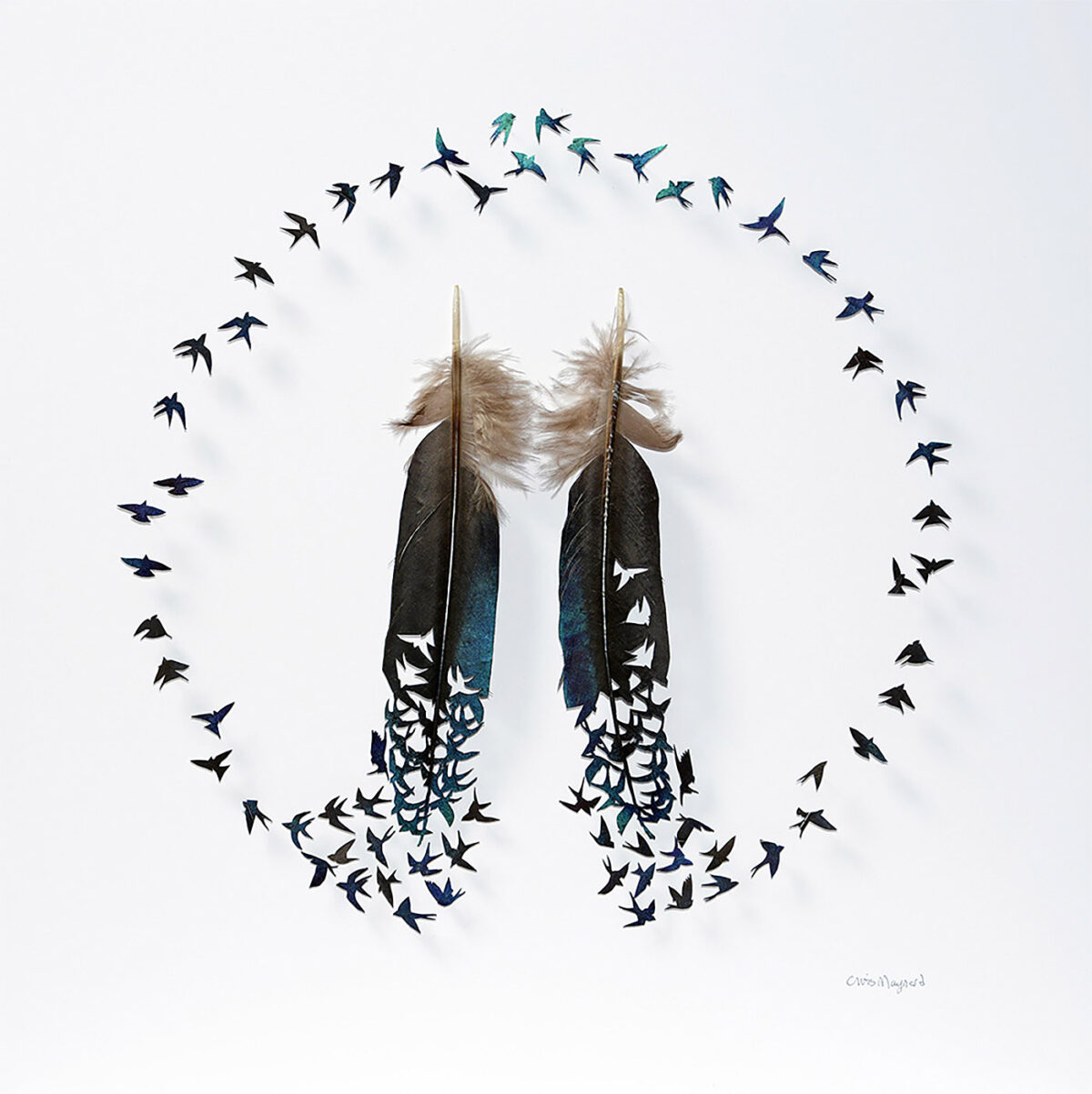 Chris Maynard is an artist who has carved a unique niche for himself by transforming feathers into intricate works of art. His journey began in the woods of Washington State, where a childhood fascination with birds and their feathers grew into a profound artistic expression. Maynard’s pieces are not just visually stunning; they are a celebration of the natural beauty and function of feathers, often displayed in shadow boxes that add depth and perspective to his creations.