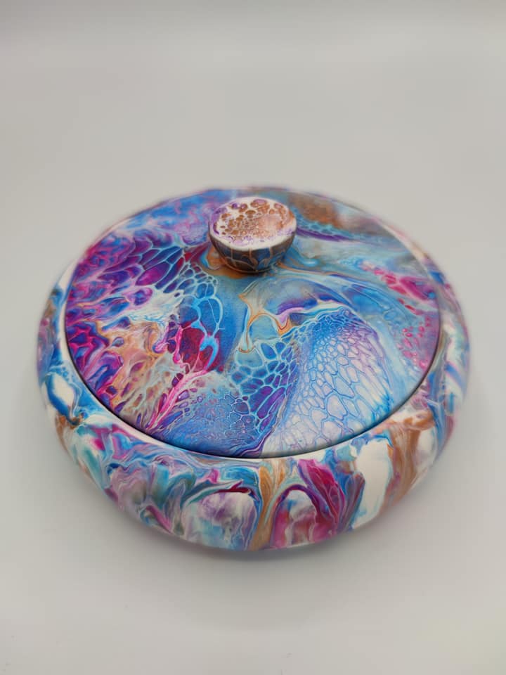 I am a 52 year old wedding photographer living in the southern part of Germany. My artist pseudonym is Augenpoesie, which means poetry for the eyes. I love creating beautiful colourful artwork. I am not attached to one artform and only recently started with acrylic pouring, which is a messy and often unpredictable artform. Normally my artwork is very accurate and precise but with pouring you have to let loose. You can choose the colours but never the exact outcome. I started with canvasses but then switched to 3D-objects. Some of the objects I make myself, some I find on fleamarkets, some I buy. I want my art to be as lively, beautiful and colourful as possible.