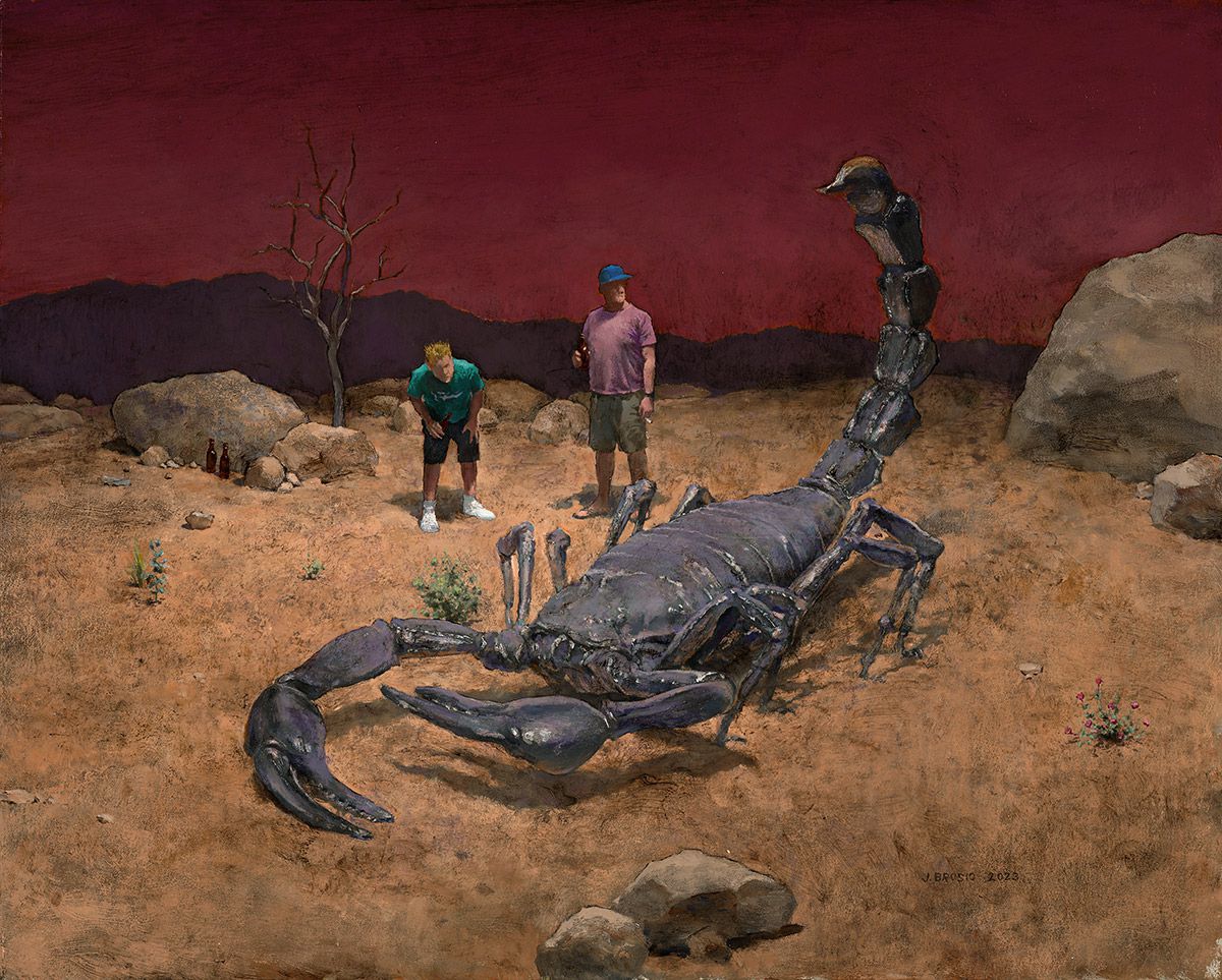 John Brosio, an American painter, masterfully blends elements of science fiction and surrealism to create unsettling yet captivating scenes of everyday life. His paintings often feature monstrous, Godzilla-like phenomena such as crows, dinosaurs, crabs, chickens, and tornadoes towering over otherwise calm suburban settings. Using oil on canvas, Brosio’s works are characterized by their detailed realism, which contrasts sharply with the epic and fantastical elements he incorporates. This juxtaposition not only highlights the absurdity and unpredictability of modern life but also evokes a sense of fear, isolation, and humor.