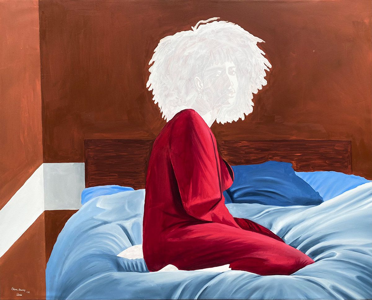 The artist’s oeuvre is characterised by a distinctive use of color and compositional technique and his iconography of figures drawn from both fantasy, history and his private world. Each canvas starts with the intentional elimination of the protagonist’s skin color, over which Emecheta frames the subject’s posture and characteristics. Diverting the attention away from the skin color, he draws our focus to the figure itself and its surroundings broadening the interpretation and inviting the viewer to become physically and emotionally invested in the subject’s story, almost revealing the aura of the person portrayed.