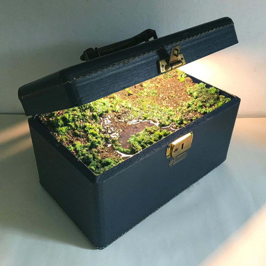 Kathleen Vance, a New York-based environmental artist, creates enchanting miniature ecosystems inside vintage suitcases in her series “Traveling Landscapes”. These intricate works of art feature soil, live plants, and water bodies, meticulously arranged to mimic natural landscapes. Vance’s use of vintage luggage not only adds a nostalgic touch but also emphasizes themes of travel and the displacement of nature. Each piece serves as a reminder of the preciousness of natural resources and the importance of preserving them.