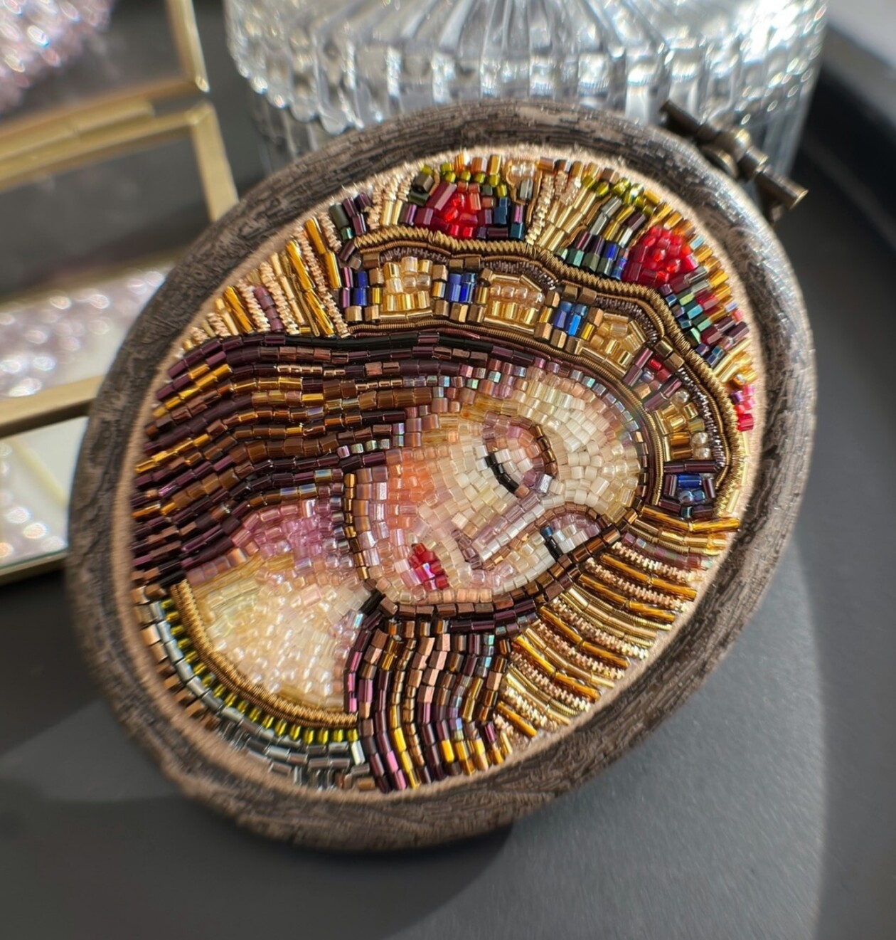 Valeria Khrystyna’s work in bead embroidery art is a testament to the incredible precision and creativity that can be achieved in this medium. Her pieces, often inspired by cultural and historical themes, showcase an extraordinary level of detail, bringing each figure to life with a vibrant sense of character and depth.