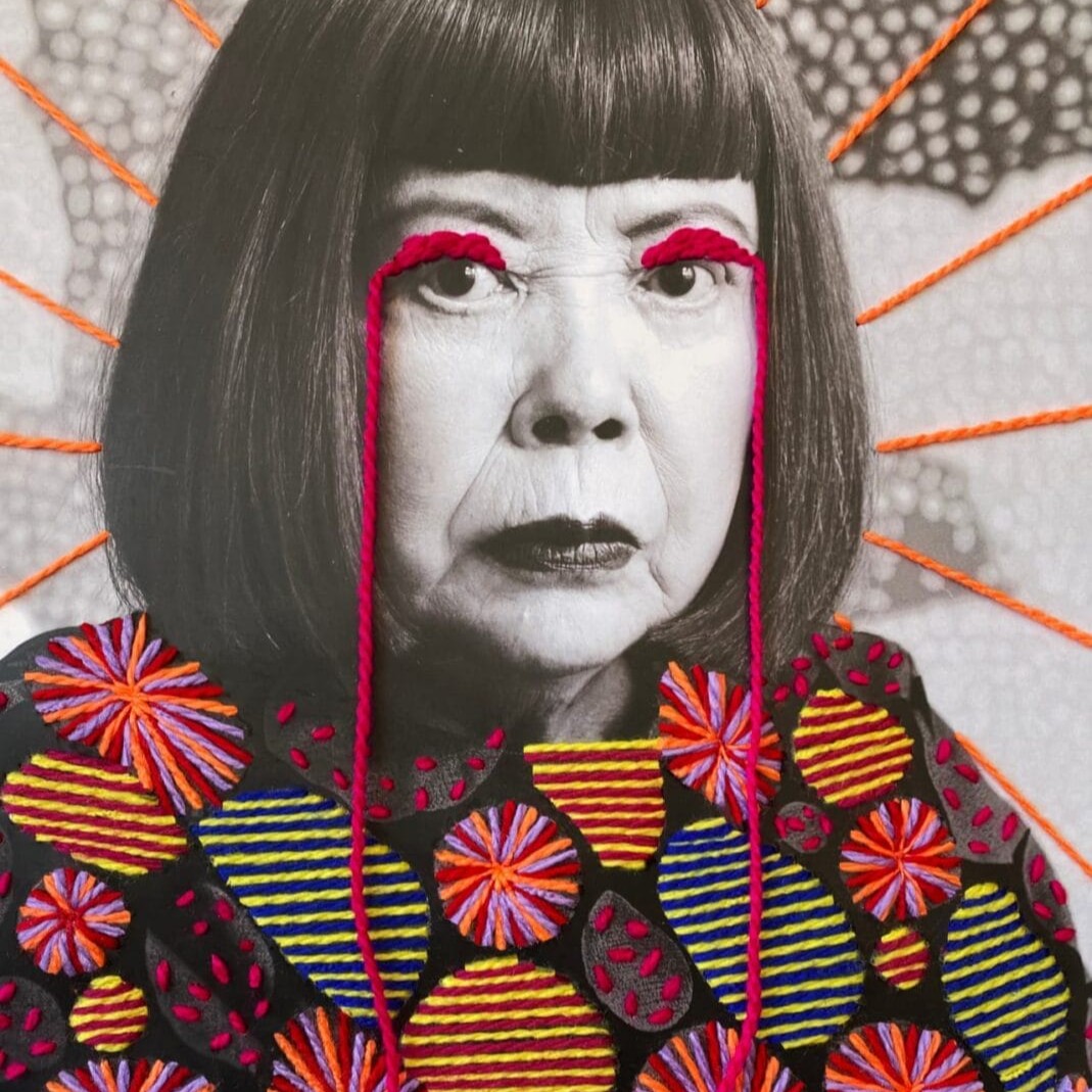 Villasana deepens her practice by selecting black-and-white portraits of celebrated icons and embedding geometric embroidery that resonates with cultural symbolism. Turquoise thread pulses from Nelson Mandela’s raised fist; golden chevrons trace Chadwick Boseman’s shirt collar; Yayoi Kusama’s dotted attire erupts into a multicolored tapestry of lines and shapes. The embroidery often flows past the confines of the photograph, creating a sense of movement and open-ended storytelling.