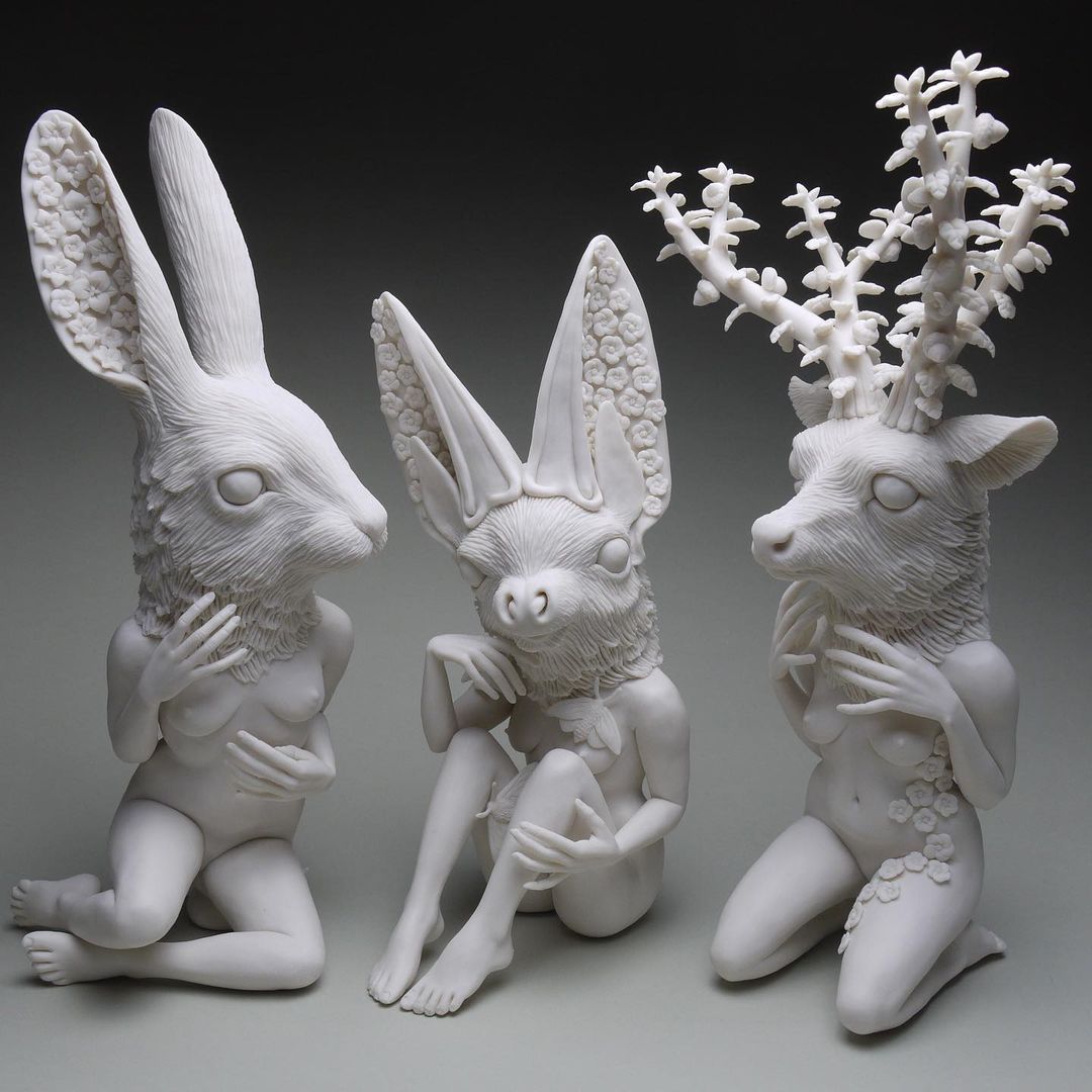 Morey’s sculptures are crafted from porcelain, a delicate medium that contrasts beautifully with the strength and resilience of the figures they portray. By combining human and animal forms, she compels us to reexamine our place within the natural world. Her work is a poignant reminder that we are not separate from the environment, but rather integral parts of a complex and interdependent ecosystem.