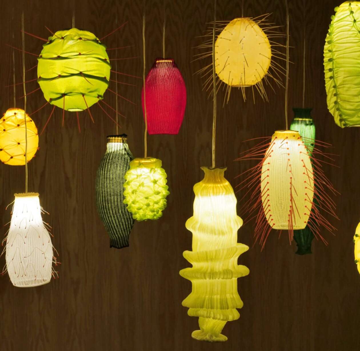 The KAUANI series showcases a variety of shapes and textures, from the geometric patterns of agave leaves to the rhythmic arrangements found in corn husks. Llasera and Quezada also draw inspiration from the unique characteristics of seeds and fruits like mamey and guanabana, as well as the rich pigments of cacao and chili peppers. These elements are translated into knitted textile skins adorned with delicate spikes, ruffles, and tendrils, resulting in lanterns that blur the line between representation and abstraction.